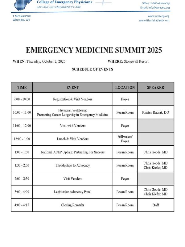 WVACEP's Emergency Medicine Summit will be held on Thursday October 2nd, 2025 with WVACEP's 50th Anniversary Celebration the following day Friday October 3rd, 2025.
